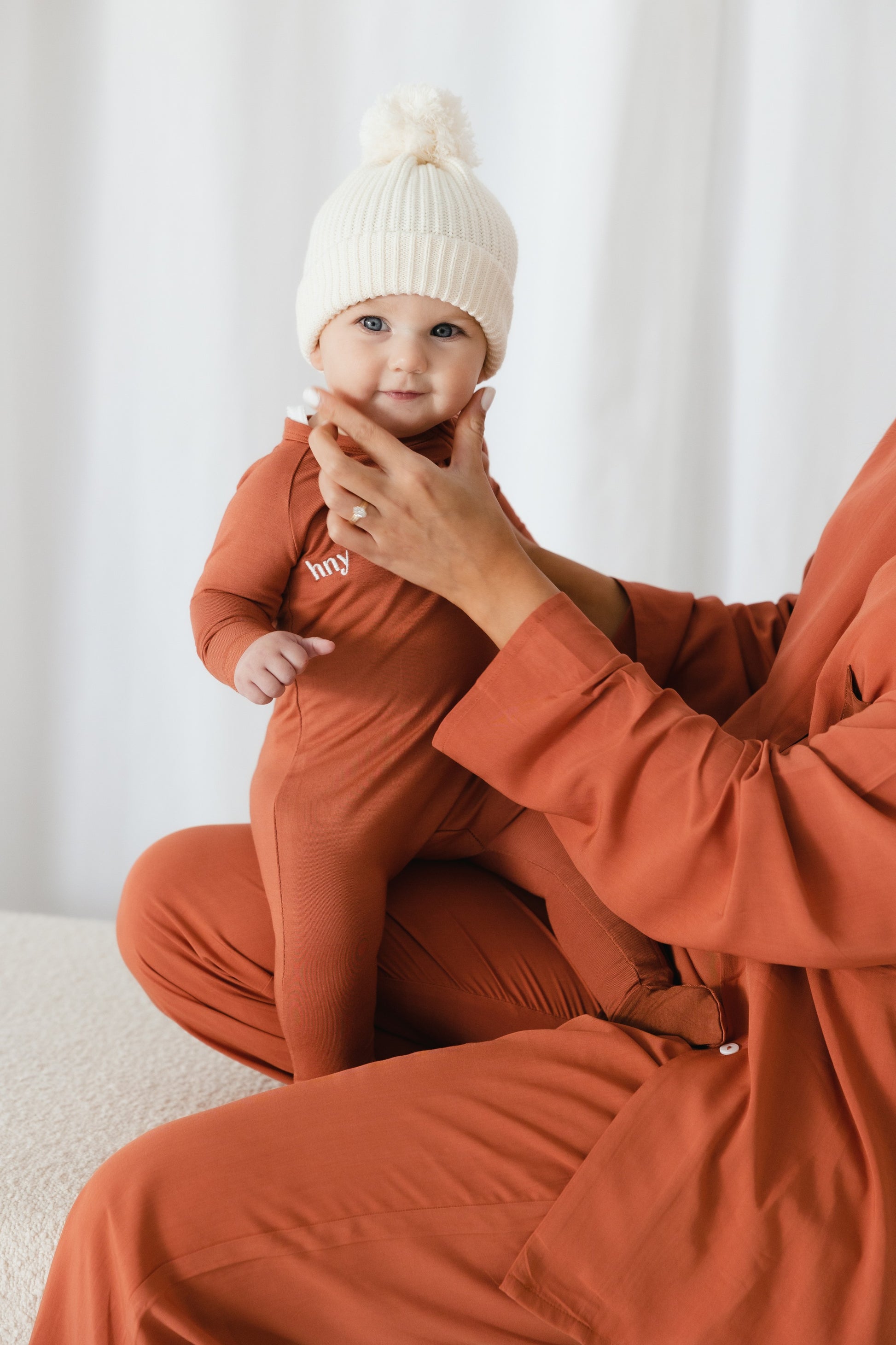 Bailey is one of our long-sleeve onesies for little hnys. It is the perfect addition to your little one's wardrobe. Our Bailey long-sleeve onesie is available in our exclusive Baked Clay and Brandy colours, allowing your little one to match Mum in style with our Alle set.