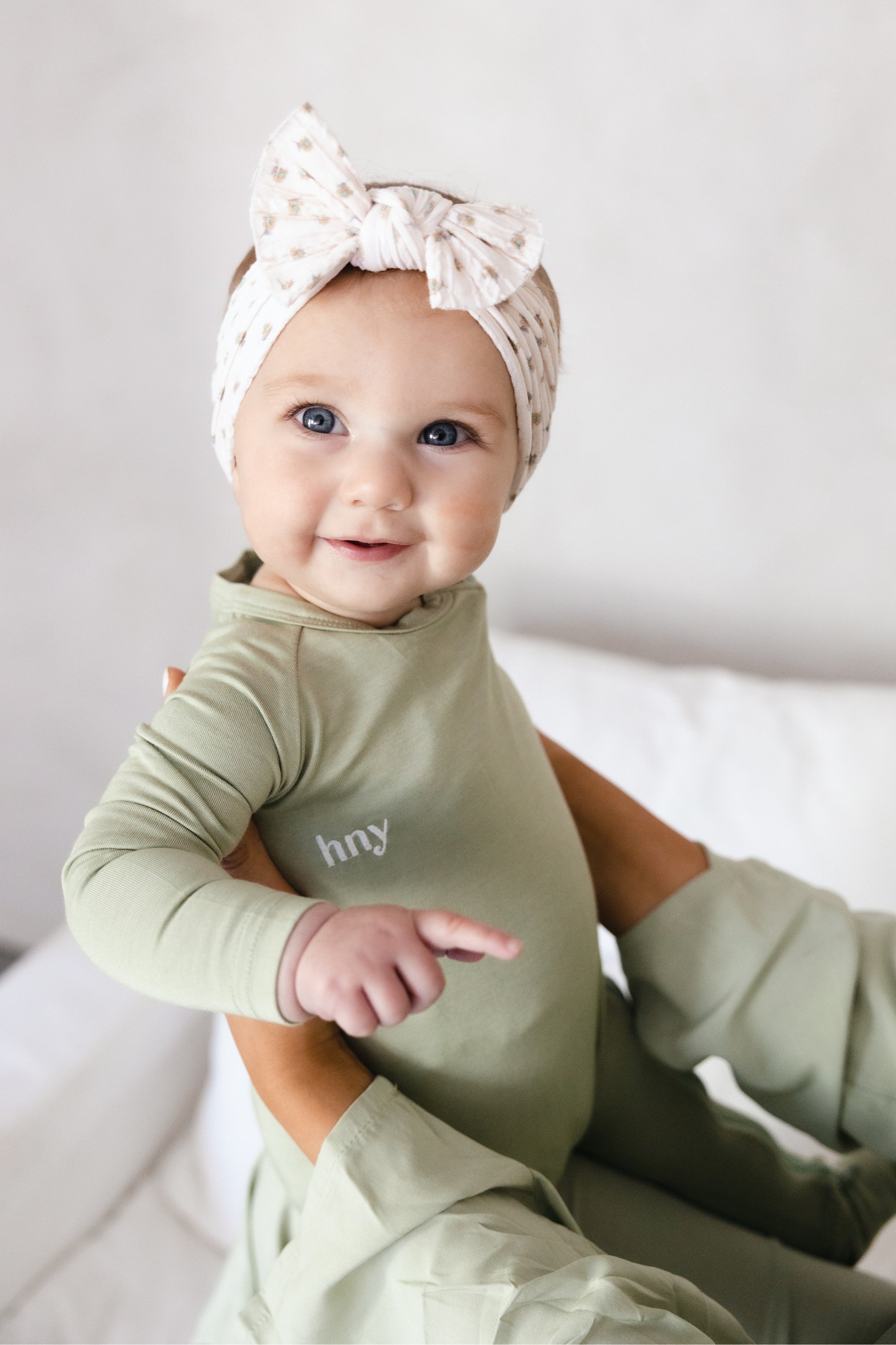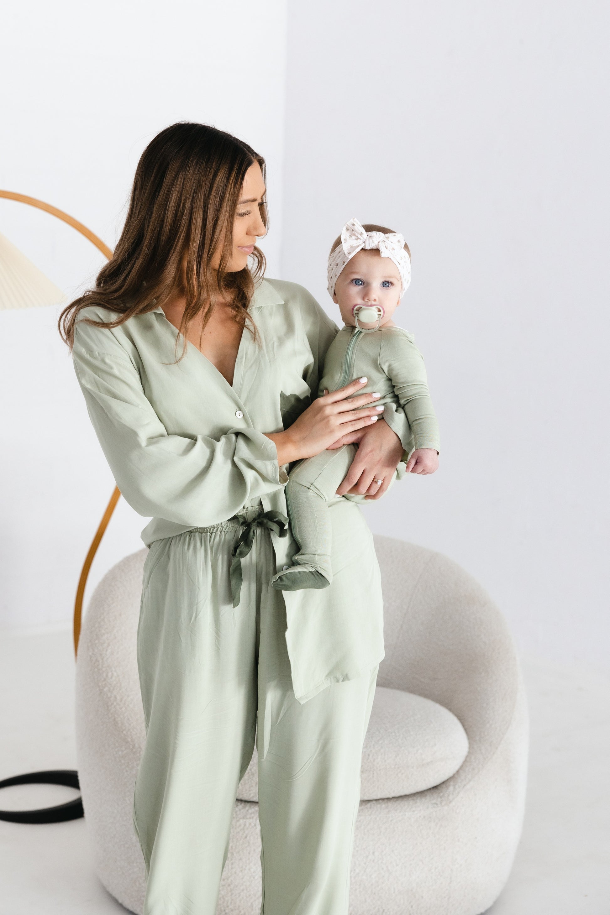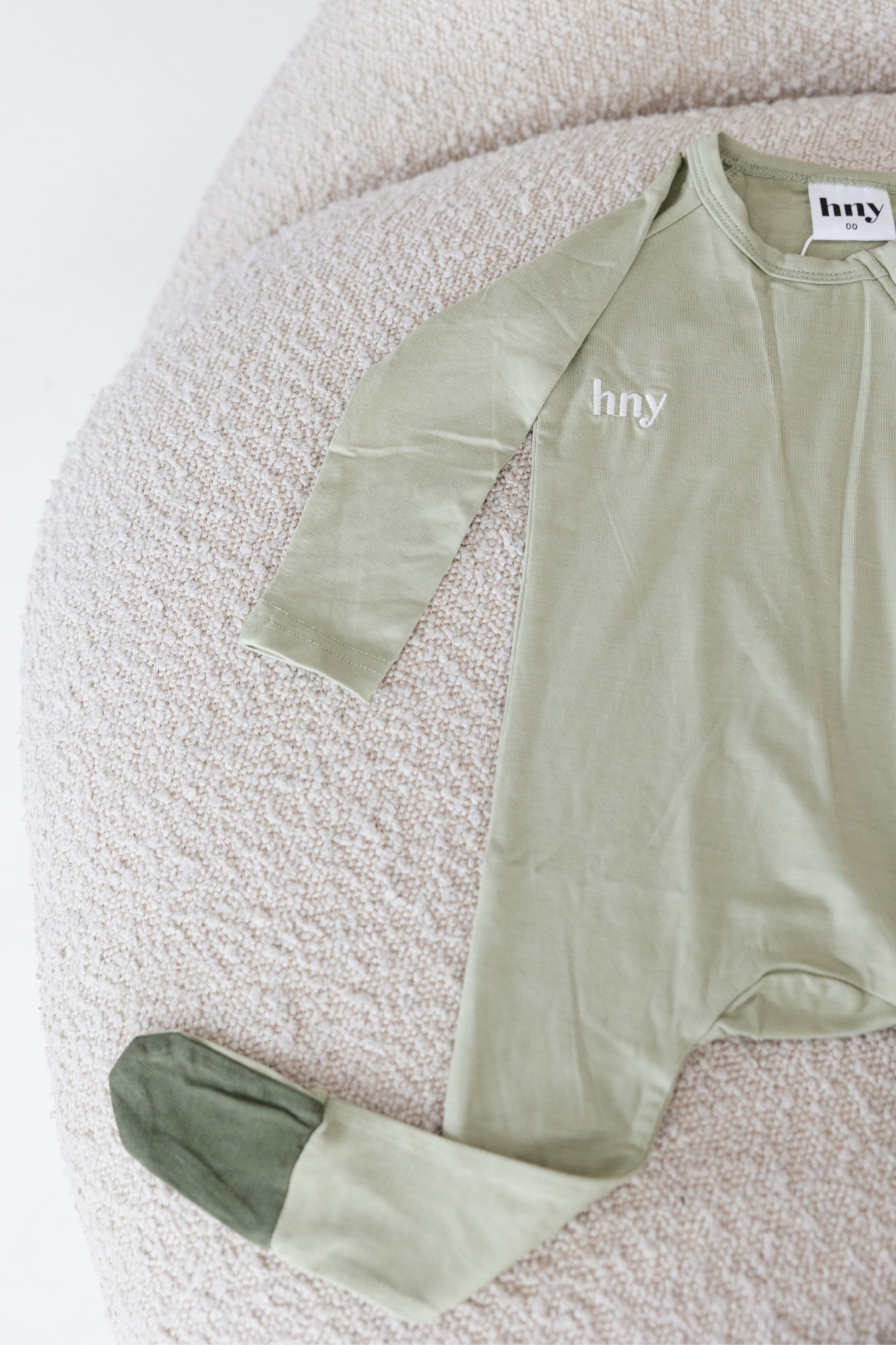 Bailey is one of our long-sleeve onesies for little hnys. It is the perfect addition to your little one's wardrobe. Our Bailey long-sleeve onesie is available in our exclusive Desert Sage and Clover colours, allowing your little one to match Mum in style with our Alle set.