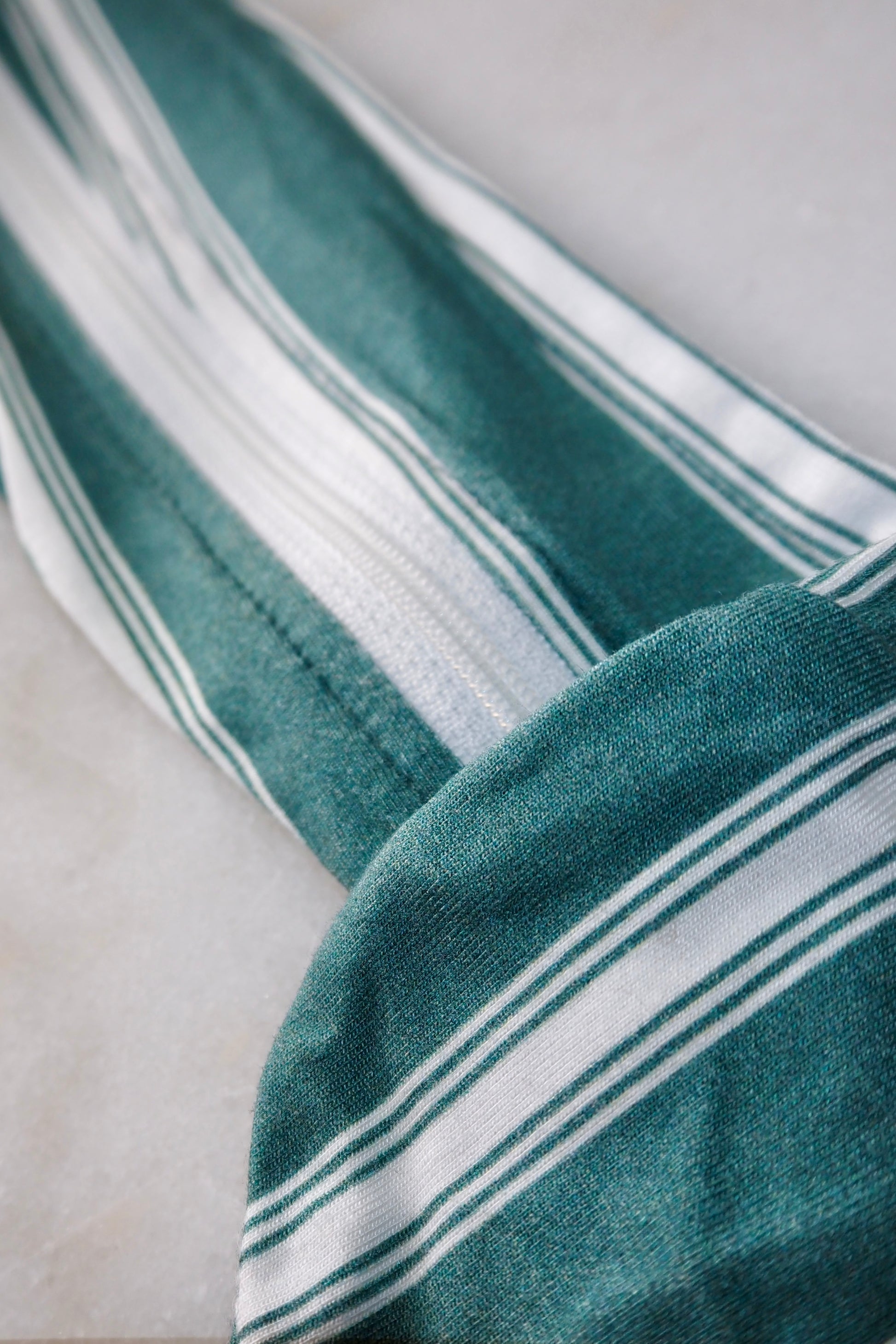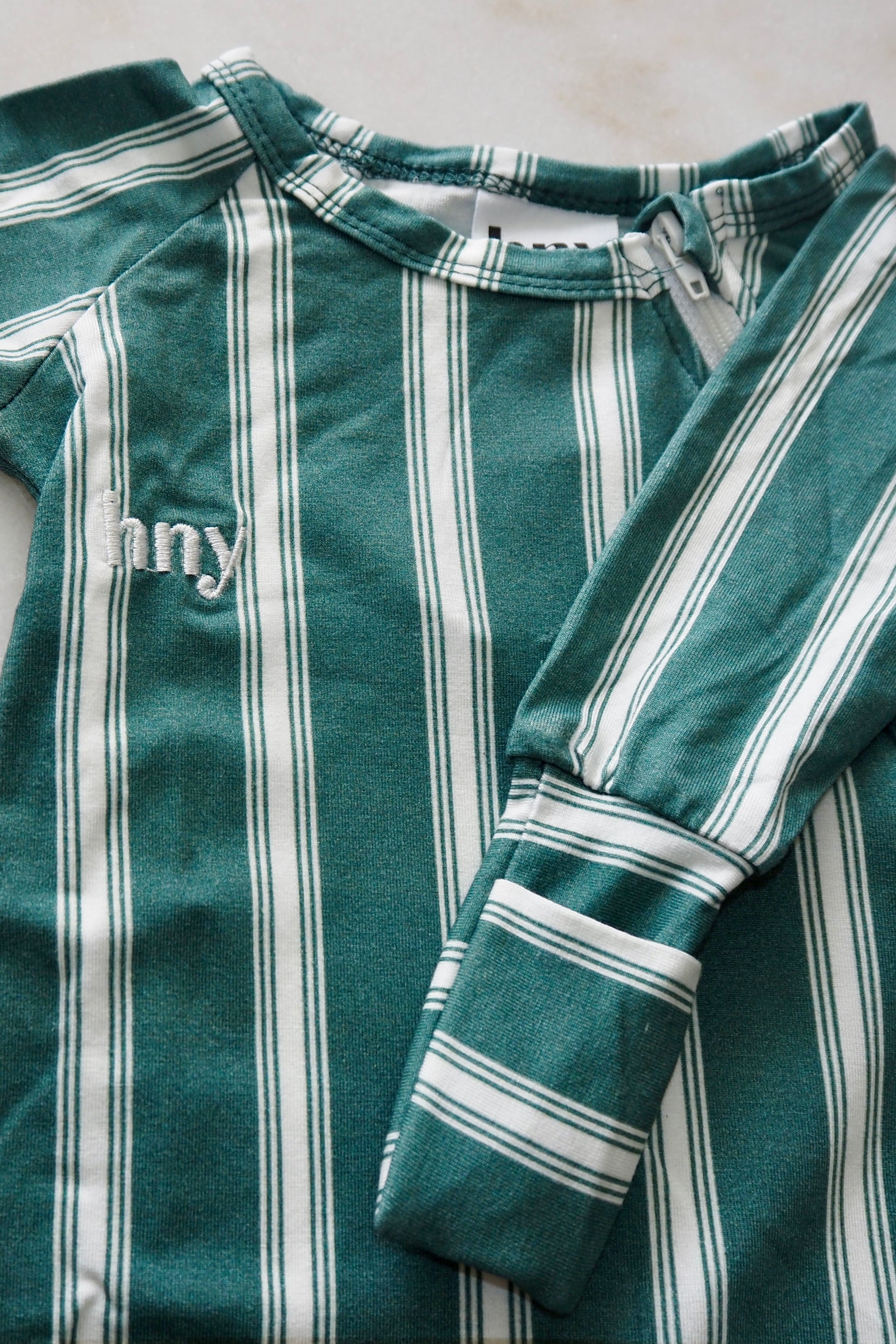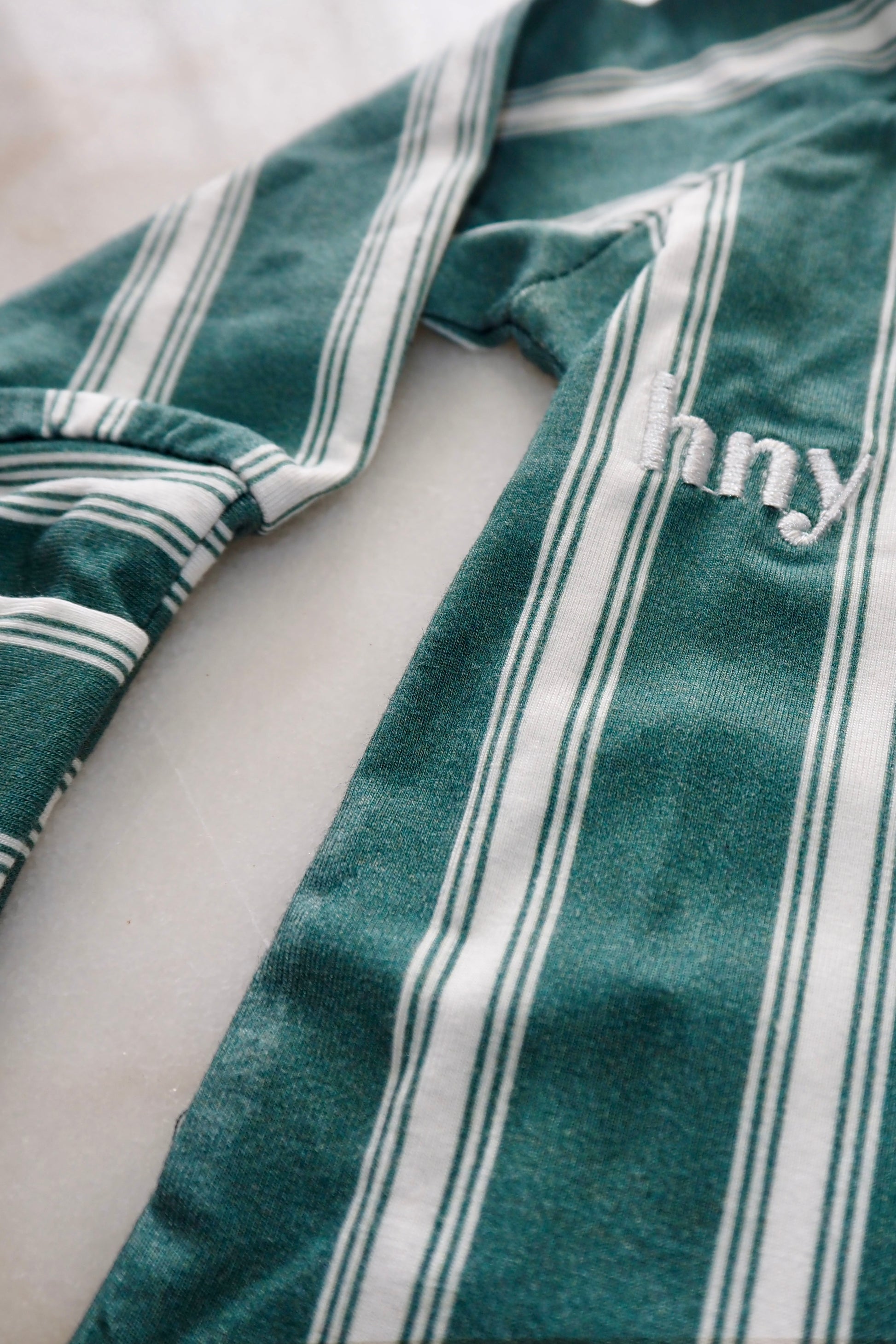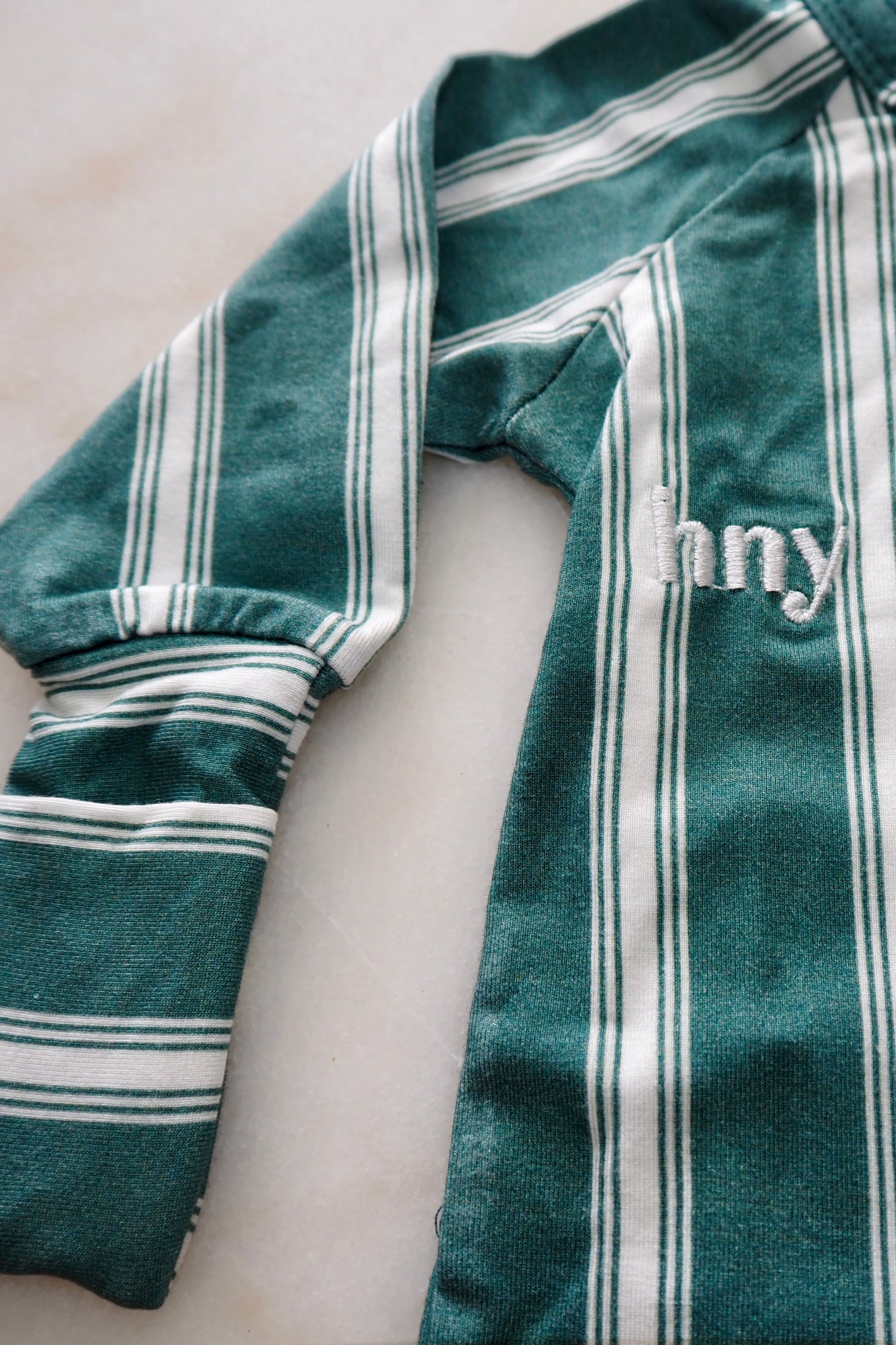 Riley is one of our long-sleeve onesies for little hnys. It is the perfect addition to your little one's wardrobe. Riley features our exclusive twin-striped design in white and dark cyan, made to match with mum with our women’s sleepwear set Remi, creating a perfect opportunity for a matching look with your little one